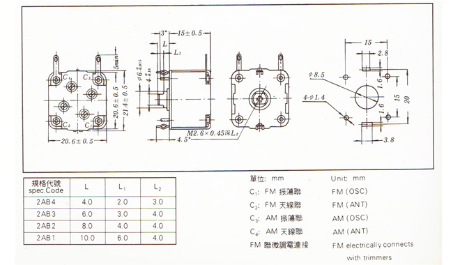 技术特性 Specifications 型号 Model 绝缘电阻 Insulation Resistance (MΩ) 动片接触电阻 Rotor Contanct Resistance (MΩ) 耐电压 Voltage Proof (V.D.C) Q 转动力矩 Operating Torque (gf.cm) 止端力矩 End Stop Torque (kgf.cm) 微调增量 Trimmer Cap.Swing (pF) 转动方向 Rotation Direction 转动角度 Rotation Angle AM:(1MHz50pF) FM:(100MHz10pF) CBM-443AF-2AB4 AM:≥500 FM:≥250 ≤10 ≥100 ≥500 ≥200 50~400 ≥5 ≥5 · 电容量曲线 Capacitance curve 型 号 Model 联别Section 转角关系及电容增量 Coeff of Rotation and Cap Swing (%pF) 100 90 80 75 70 60 50 40 30 25 20 10 (3) CBM-443AF-2AB4 AM 335.0 282.7 227.5 201.0 175.2 127.3 87.8 57.0 34.2 25.4 17.8 5.8 0 FM 20.0 17.24 14.67 13.46 12.30 10.08 8.02 6.10 4.30 3.45 2.62 1.05 0 外形尺寸 Outline dimensions